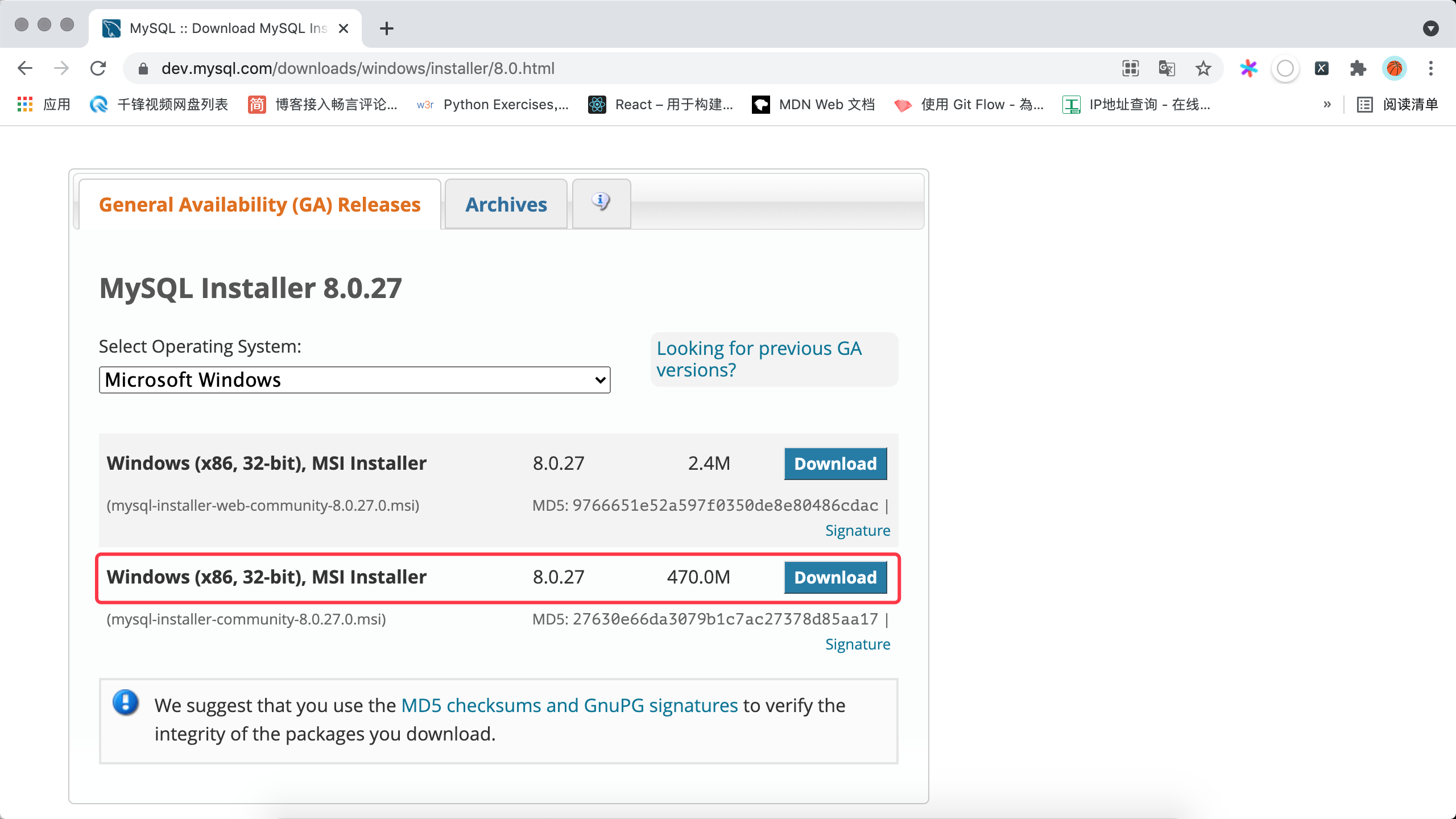 通过官方网站提供的下载链接下载“MySQL社区版服务器”安装程序,如下图所示,建议大家下载离线安装版的MySQL Installer。