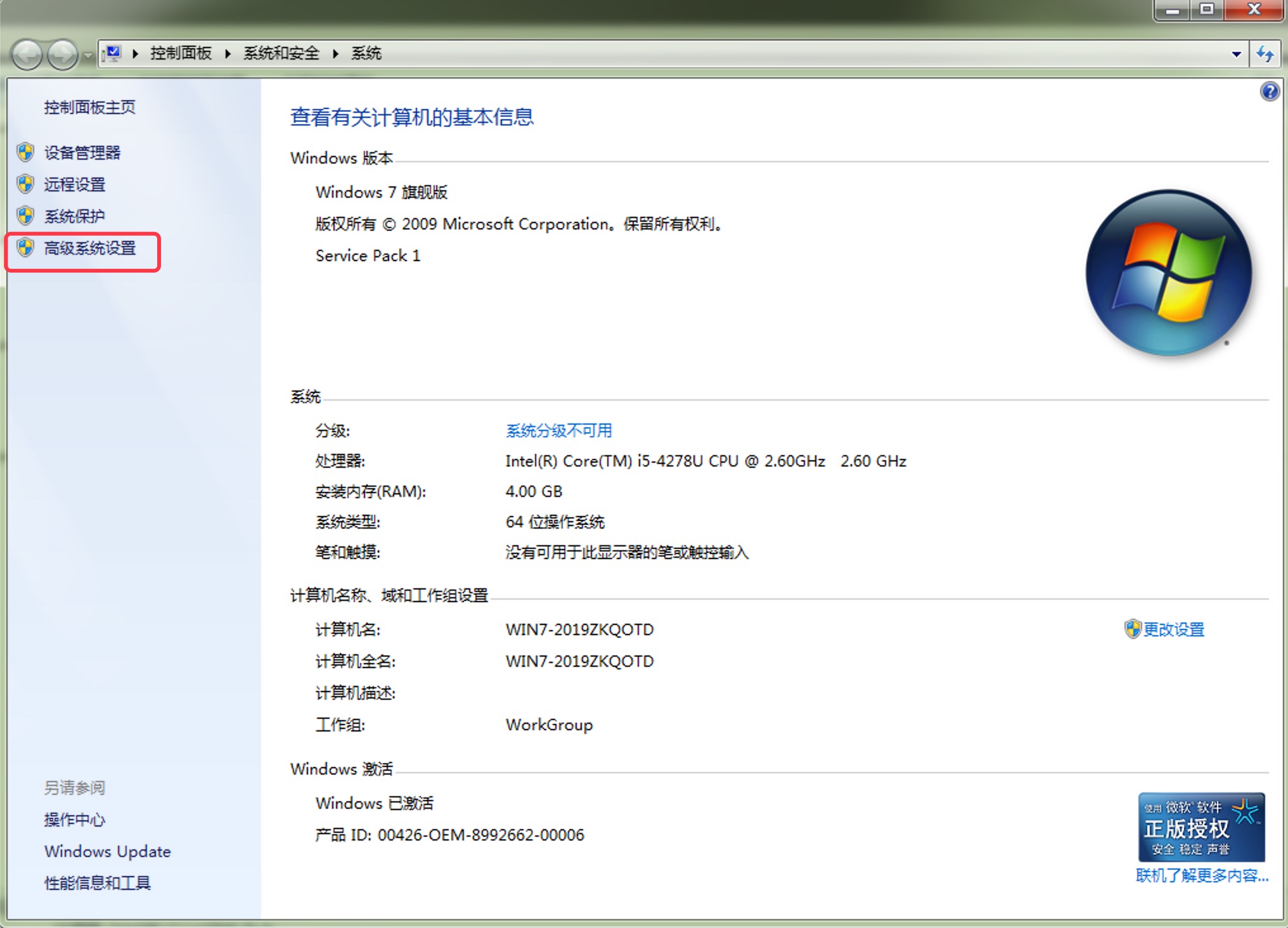打开 Windows 的“系统”窗口并点击“高级系统设置”。