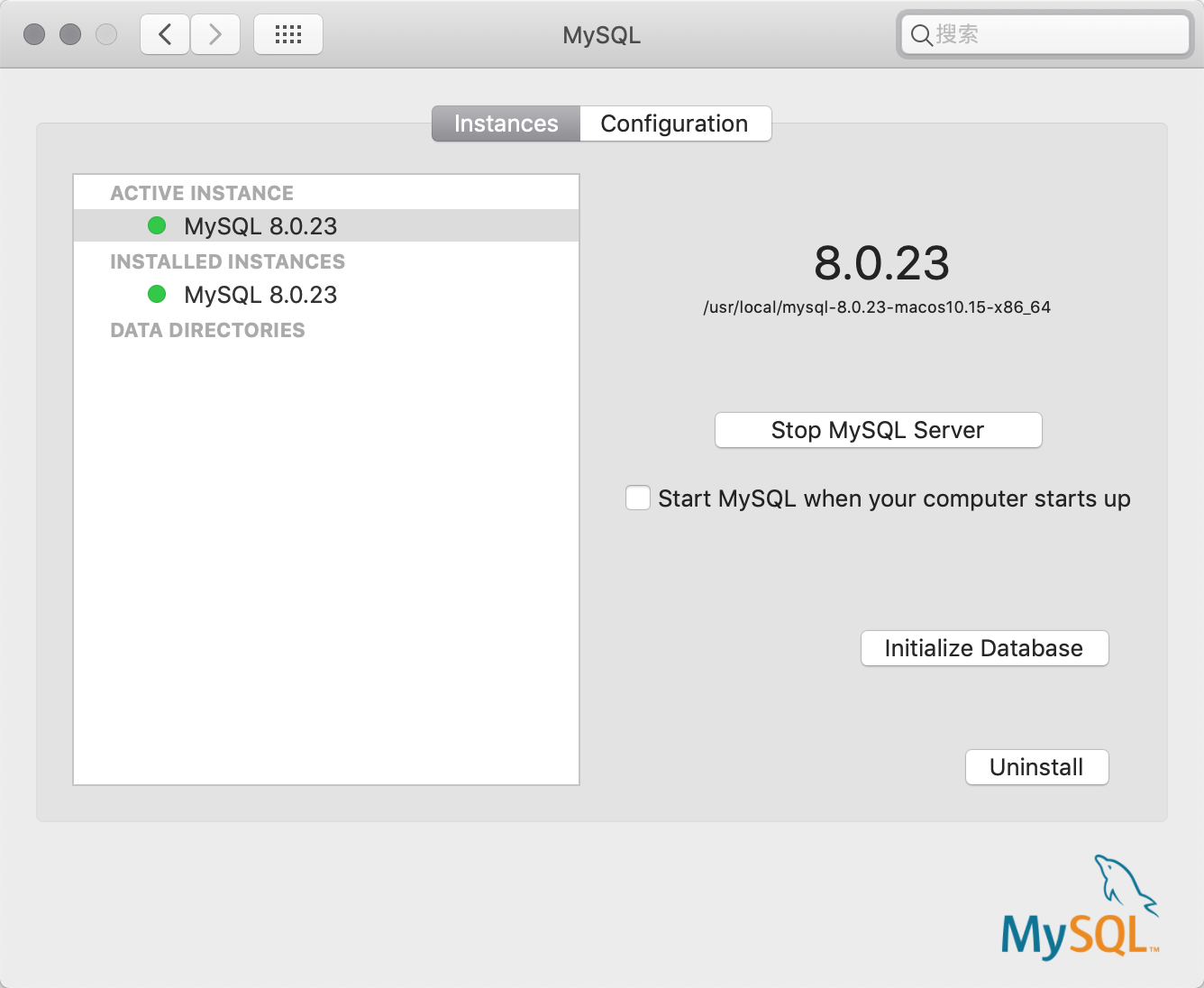 安装成功后,可以在“系统偏好设置”中找到“MySQL”,在如下所示的画面中,可以启动和停止 MySQL 服务器,也可以对 MySQL 核心文件的路径进行配置。