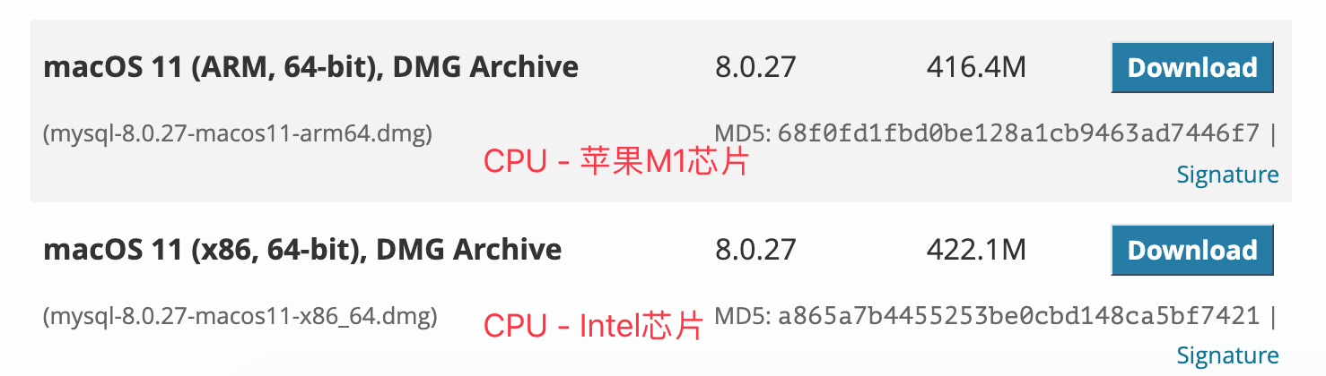 macOS 系统安装 MySQL 是比较简单的,只需要从刚才说到的官方网站下载 DMG 安装文件并运行就可以了,下载的时候需要根据自己使用的是 Intel 的芯片还是苹果的 M1 芯片选择下载链接,如下图所示。