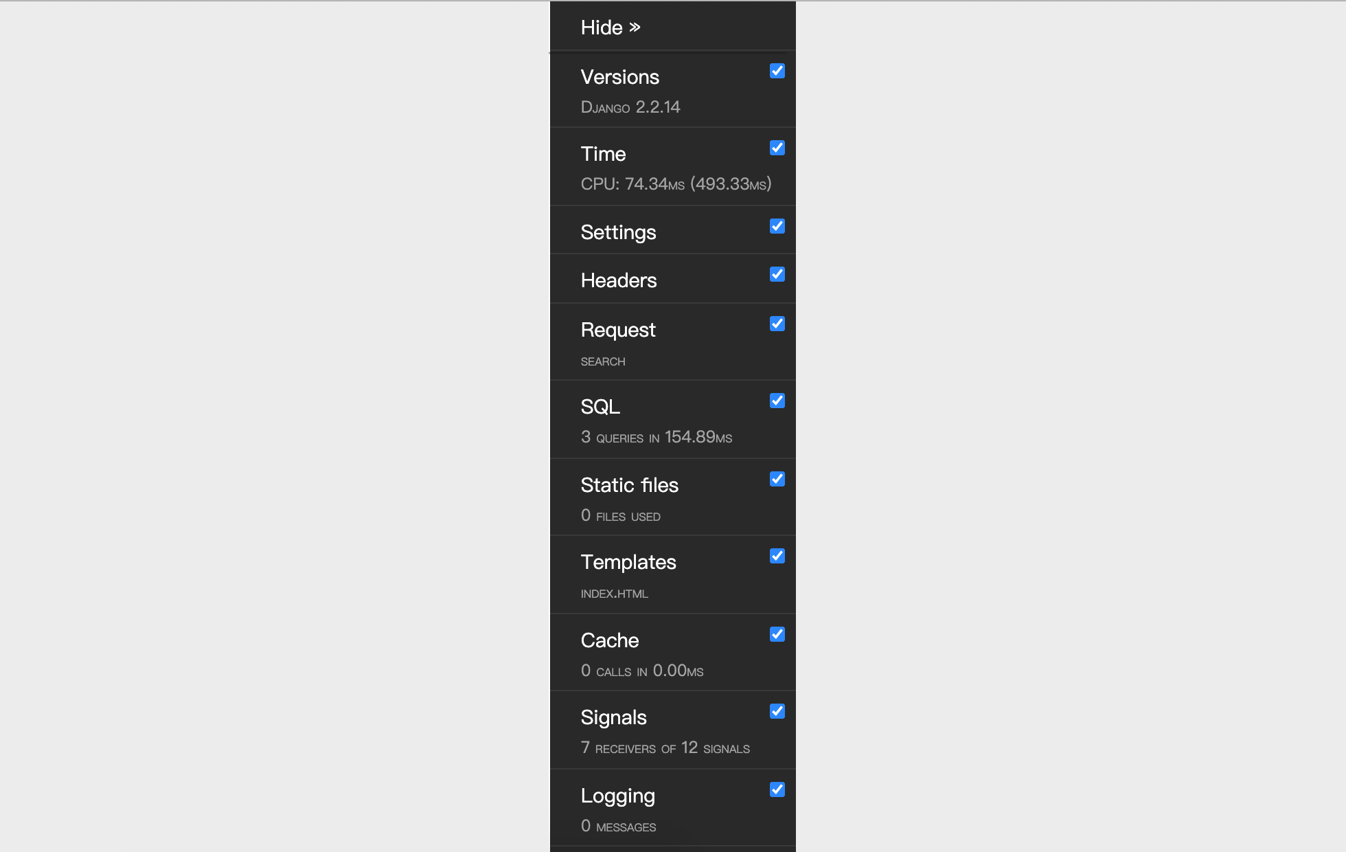 1. 在配置好Django-Debug-Toolbar之后,页面右侧会看到一个调试工具栏,如下图所示,上面包括了如前所述的各种调试信息,包括执行时间、项目设置、请求头、SQL、静态资源、模板、缓存、信号等,查看起来非常的方便。
