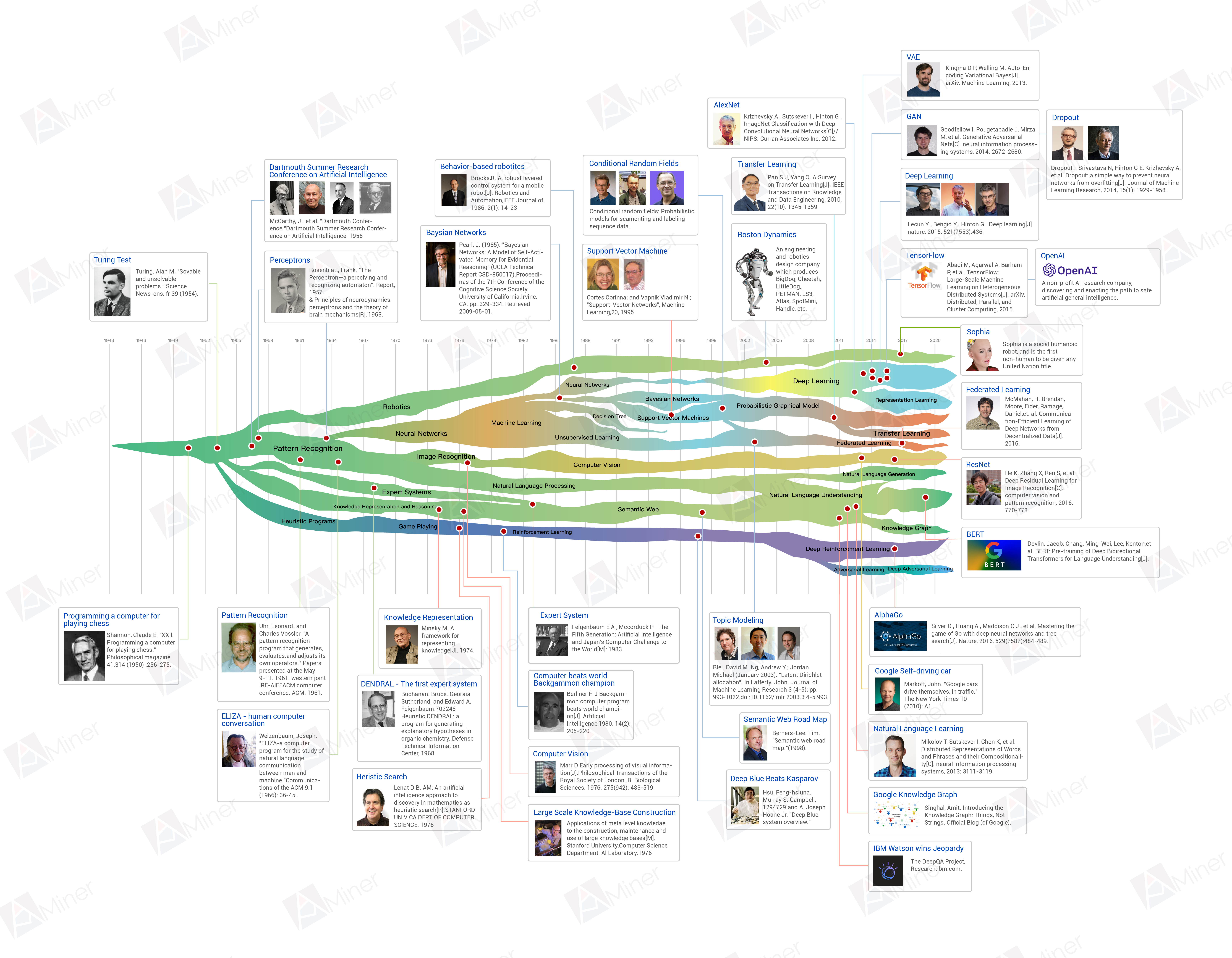 - 1956年,达特茅斯会议召开,该会议被认为是人工智能的诞生标志。会议上约翰·麦卡锡、马文·明斯基、克劳德·香农等人提出了人工智能的研究议程。达特茅斯会议的几位主要参与者也被后人誉为“人工智能七侠”,包括约翰·麦卡锡、马文·明斯基、阿伦·纽厄尔、赫伯特·西蒙、克劳德·香农、奥利弗·塞尔弗里奇和内森·罗切斯特,他们为人工智能的发展奠定了基础,其中有五个人获得了图灵奖。