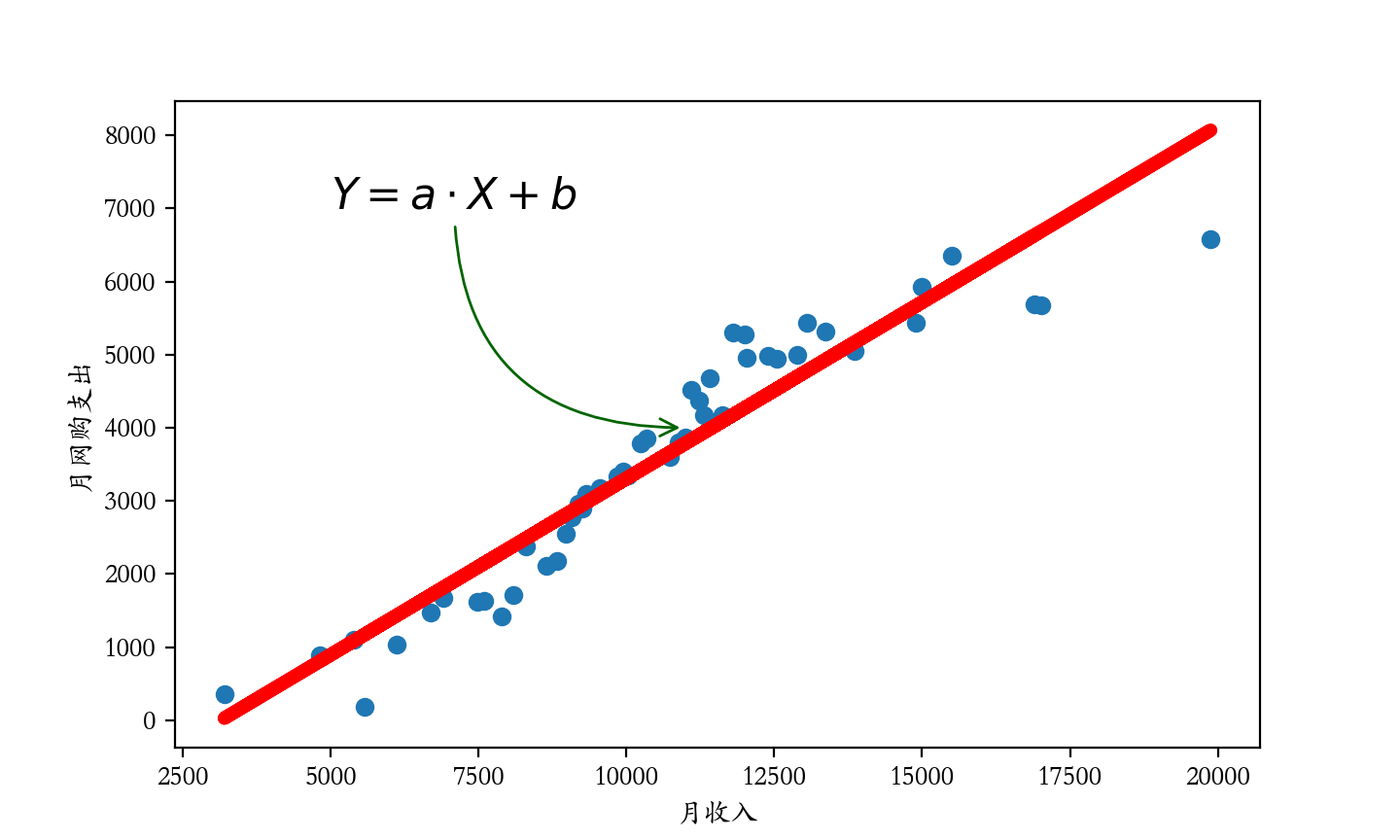 我们换一种思路来预测网购支出,我们将月收入和月网购支出分别作为横纵坐标来绘制散点图。既然网购支出跟月收入之间存在强正相关,这就意味着可以找一条直线来拟合这些历史数据点,我们把这条直线的方程\(\small{Y = aX + b}\)称为回归方程或回归模型,如下图所示。