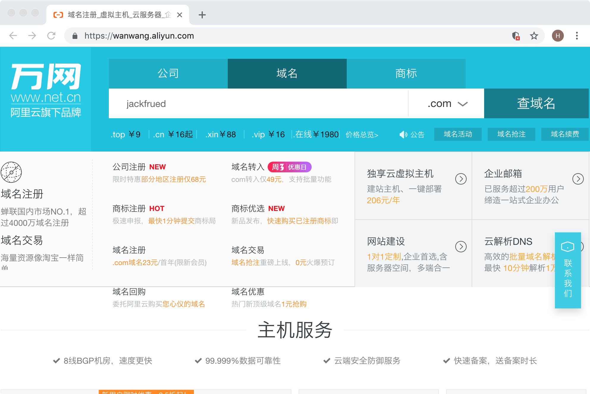 虽然我们已经通过GitHub提供的域名访问到了自己的博客,但是如果我们不愿意“寄人篱下”,我们在利用GitHub Pages提供的托管服务同时,也可以将博客绑定到自己专属的域名。如果暂时还没有购买域名,我们可以在提供域名购买服务的网站(如:万网、GoDaddy)上进行购买。